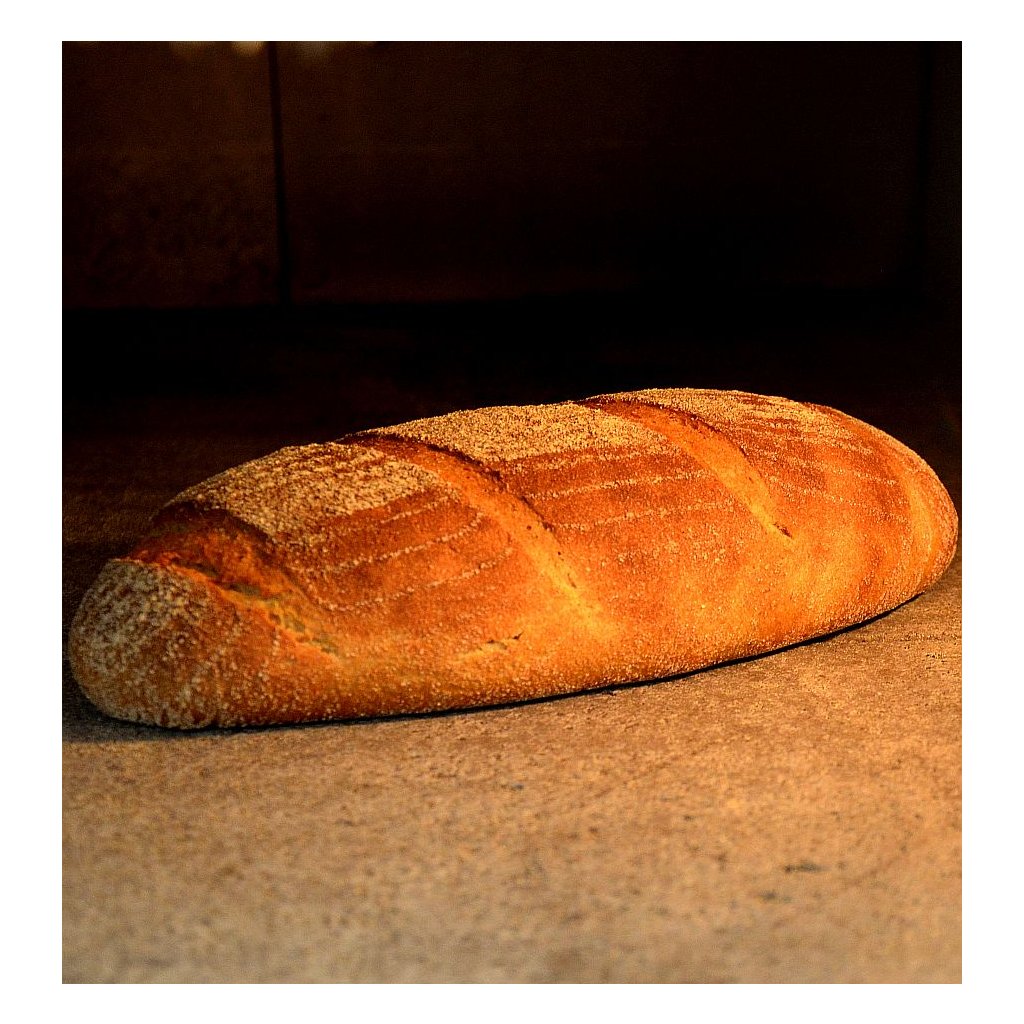 Tento chléb je ze 100% bio tvrdé pšenice. Mouku si sami meleme v našem mlýně těsně před pečením. Chleba necháváme růst v ošatkách a pečeme jej v kamenné peci. Chleba bez přidání jakýchkoliv chemických přísad. Pokud jej jednou zkusíte, zamilujete si ho...