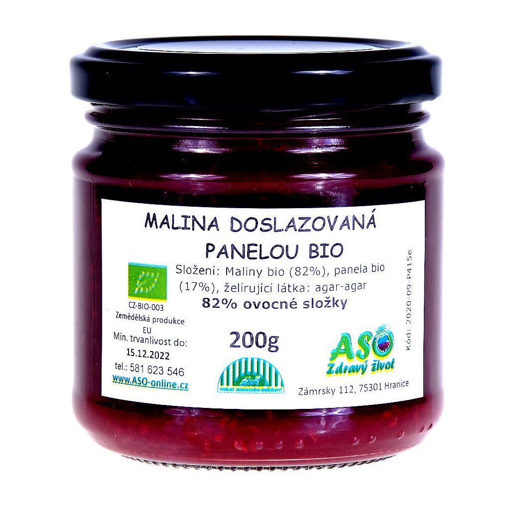 Složení: Maliny bio (82,2%), panela bio (17,2%), želírující látka: agar-agar (přírodní želatina z mořské řasy)