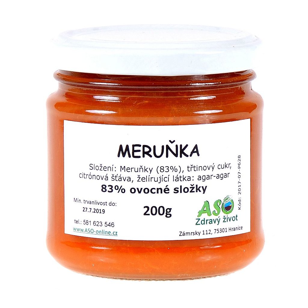 Výborná ovocná pomazánka z meruněk (83%) slazená kvalitním třtinovým cukrem. Pomazánka je vařená pouze krátce, aby bylo zachováno co nejvíce vitaminů. Poté je plněna do sterilovaných sklenic a není už dále pasterizovaná!