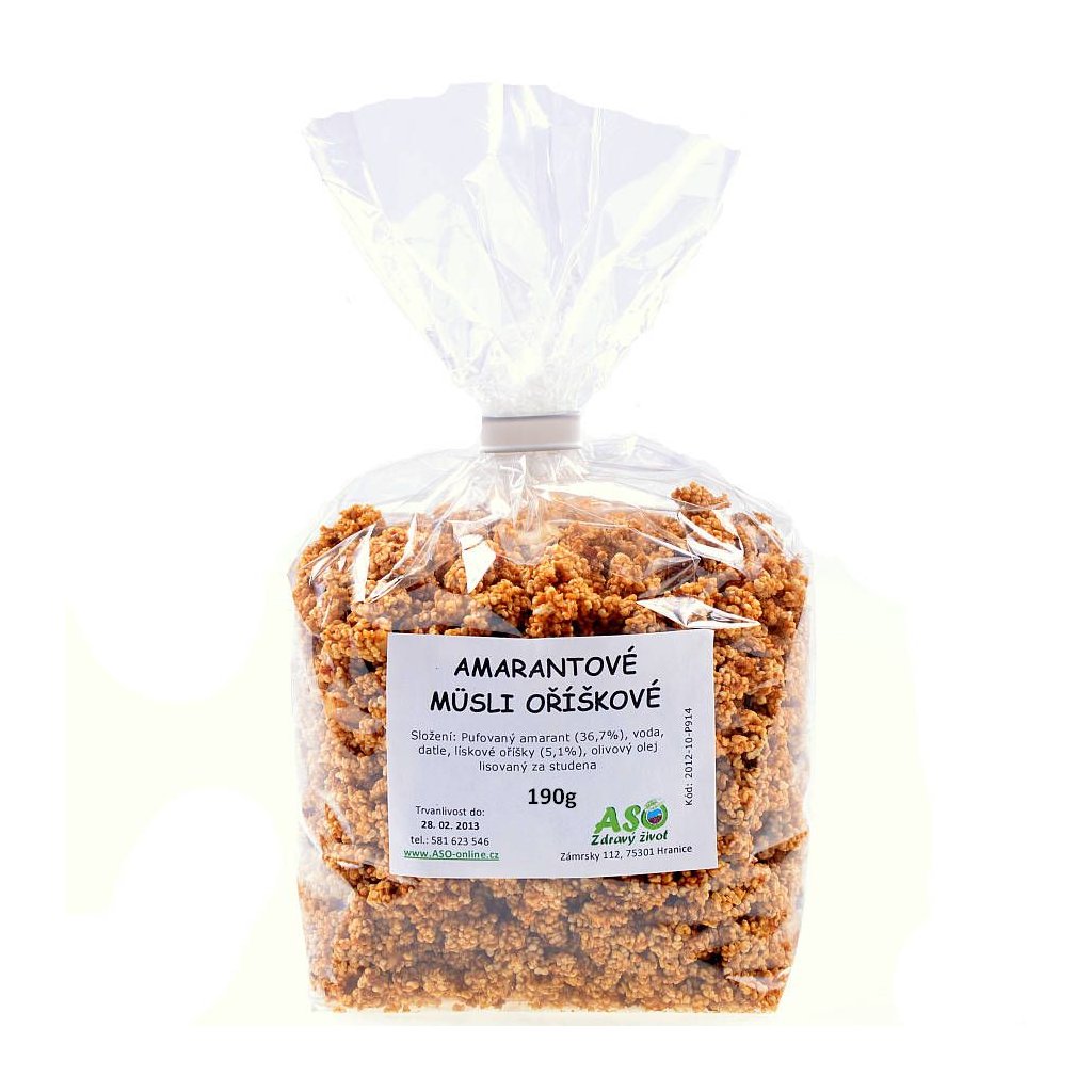 Amarantové müsli je vyrobeno z bio pufovaného amarantu, je slazené pouze datlemi a oříškovou chuť mu dodávají přidané lískové oříšky. Je určeno k přímému použití buď samostatně nebo zalité mlékem. Doporučujeme Vám vyzkoušet místo mléka ovesný, sojový nebo rýžový nápoj, který také najdete v našem obchodě.