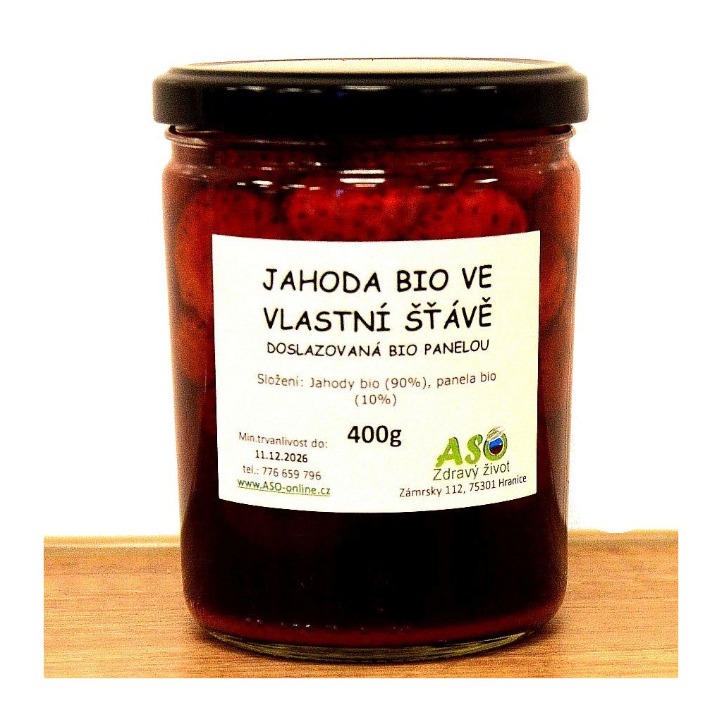 Jahoda bio ve vlastní šťávě bez přídavku vody, slazená bio panelou.
