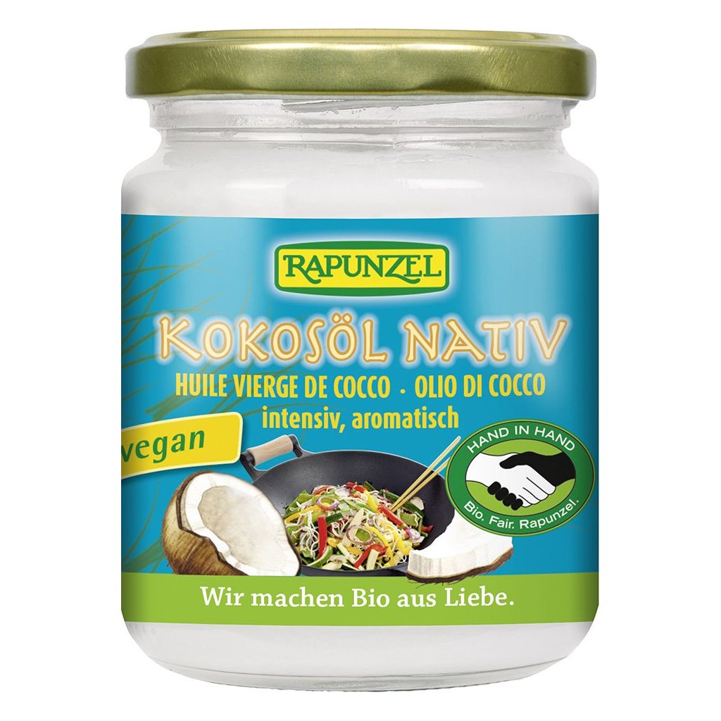Tento panenský kokosový olej se lisuje z dužiny kokosových ořechů, která se nakrájí na menší kousky, usuší a za studena vylisuje. Olej není nijak upravován a zachovává si plnou příjemnou kokosovou vůni a chuť. Panenský kokosový olej dodá pokrmům nádech exotiky. Je tepelně velmi stabilní, a proto je velmi vhodný k úpravám za vysokých teplot. Tuk neprská a nepění a je výborný na pečení a smažení. Vynikající k přípravě kokosového kari a sladkých desertů. Je vynikající i k ošetření suché pokožky, do koupele a před a po opalování. Panenský kokosový olej značky RAPUNZEL je vyráběn pěstiteli ze Srí Lanky zapojenými do projektu HAND IN HAND. Fair trade čili spravedlivý obchod garantuje farmářům z rozvojových zemí spravedlivou odměnu a zakazuje otrockou či dětskou práci.