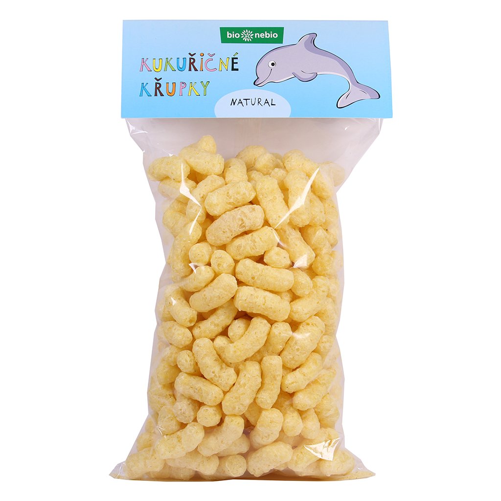 Kukuřičné křupky natural jsou nesolené a vyrobené bez přidaného tuku. Český výrobek. Jsou přirozeně bezlepkové. Oblíbené zvláště u malých dětí, 100g.